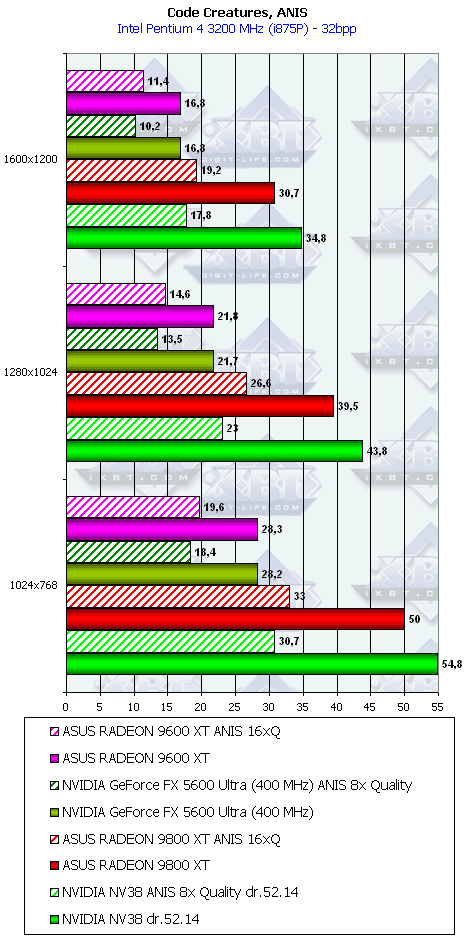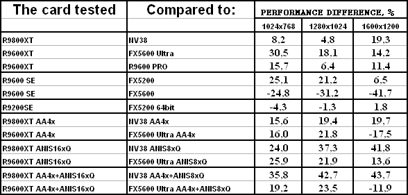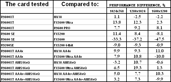 Самые легкие режимы без АА и анизотропии: RADEON 9800 XT и NV38 в целом равны,
