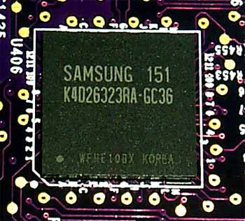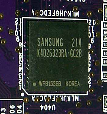 | На видеокарте установлены модули памяти от Samsung со временем выборки 3.3ns, что соответствует примерно частоте работы 300 (600) МГц, но память работает на частоте 275 (550) МГц. GPU функционирует тоже на повышенной для Ti 4200 частоте 260 МГц (обычная частота карт на Ti 4200 с 128-ю мегабайтами — 250/444 МГц.) | ![]() |