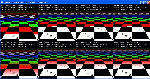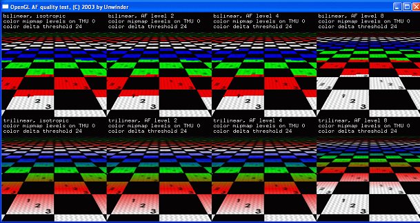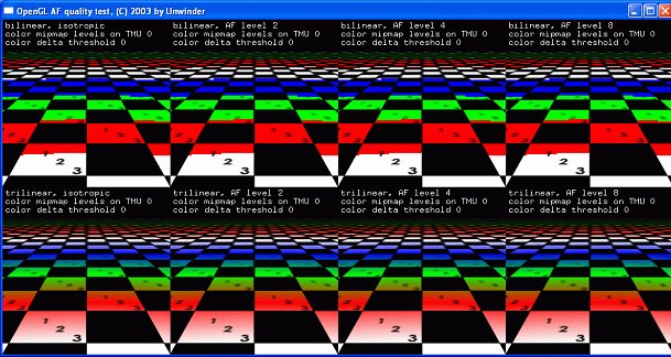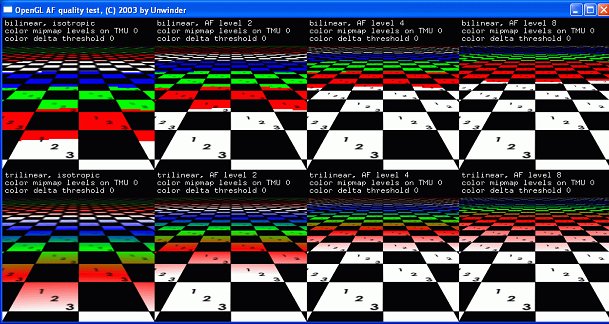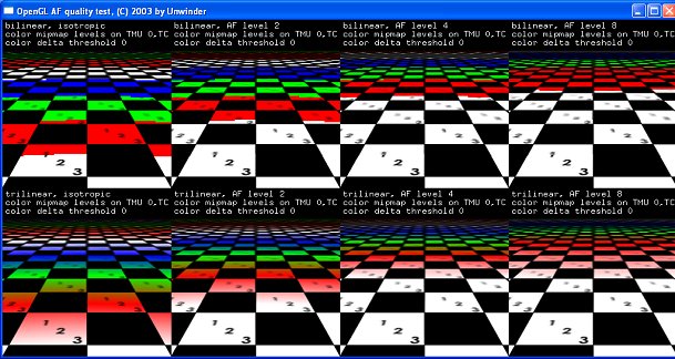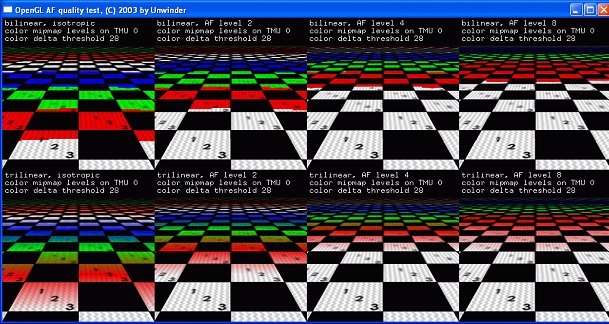 Во-первых, вспомним тот факт, что алгоритмы упрощения степени анизотропии на основе анализа чёткости текстур не активизировались в нашем тесте до тех пор, пока мы не форсировали анизотропную фильтрацию в панели настроек драйвера. Изучив код OpenGL ICD, мы пришли к выводу, что драйвер рассчитывает чёткость текстуры при её создании только в том случае, если степень анизотропии установлена в отличное от единицы значение до её создания. Такой подход гарантирует работоспособность алгоритмов анализа степени чёткости текстур при форсировании анизотропной фильтрации, однако далеко не гарантирует его работоспособность в том случае, если анизотропией управляет само OpenGL приложение. Для того, чтобы форсировать использование алгоритмов анализа чёткости текстур в нашем тестовом приложении, мы добавили код установки степени анизотропной фильтрации в значение 2 перед созданием текстур через glTexImage2D. Однако никто не даст Вам никаких гарантий, что разработчики всех OpenGL приложений будут выполнять подобные действия, так что есть вероятность того, что алгоритмы анализа чёткости текстур не будет использованы в некоторых приложениях, контролирующих анизотропию самостоятельно.