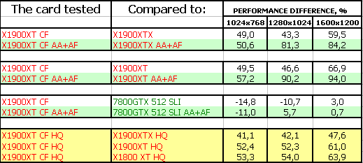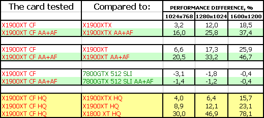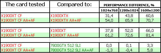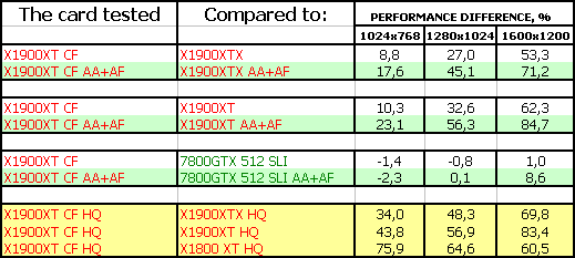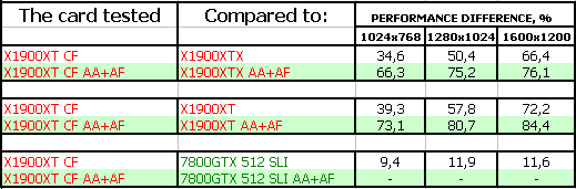 Отдача от CF весьма неплоха, хотя все же на уровне не более 50%. Что касается сражения с 7800GTX 512 SLI, то ситуация разноречивая, однако все же победа за CF, поскольку такой SLI будет явно дороже.