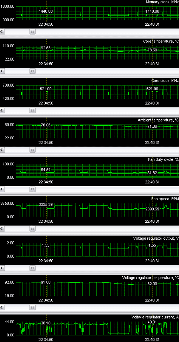 Мониторинг нам показывает, конечно, что нагрев карты очень велик. Свыше 90 градусов под нагрузкой! Но еще раз отмечу, что главная положительная особенность системы охлаждения — выброс горячего воздуха наружу, поэтому особо волноваться нет резона. К тому же, обороты кулера поднимаются даже при максимальном нагреве не столь значительно (шум чуть-чуть слышен).