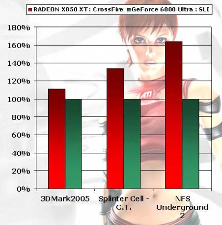 Вот такие данные по производительности решений с двумя картами, CrossFire X850 XT в сравнении с NVIDIA SLI 6800 Ultra приводит ATI (внимание: в обоих случаях задействованы две карты):