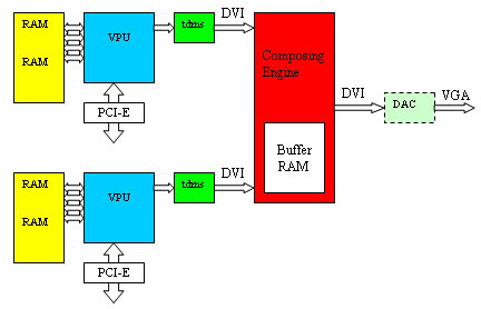 Несколько ускорителей (в варианте для пользователей их два) формируют собственную часть изображения, и выводят её через TMDS трансмиттеры в общепринятом цифровом стандарте DVI. Затем информация попадает в «черный» (на схеме — красный) ящик под названием Composing Engine, устройство, которое собственно и осуществляет совмещение результатов работы ускорителей для получения финального изображения. На выходе из этого красного ящика — вновь стандартный цифровой DVI сигнал, но на этот раз — уже финального кадра, собранного из двух порций данных, рассчитанных обоими VPU. Для устранения проблем с синхронизацией, Composing Engine содержит собственную буферную память, что позволяет этому устройству накапливать данные асинхронно, и, затем, по мере готовности обоих ускорителей, формировать и выдавать результирующий кадр. Таким образом, четкая синхронизация работы VPU не требуется, достаточно двух фактов — каждый VPU должен знать, какую часть данных ему надо рассчитать, и каждый VPU должен закончить передачу рассчитанных данных в этот «красный ящик», Composing Engine. После этого будет осуществлена передача кадра на устройство вывода, в формате DVI или (если нам нужен аналоговый сигнал) на внешний графический DAC, преобразующий цифровой DVI поток в стандартный аналоговый VGA сигнал.
