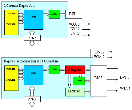 На карте с технологией CrossFire установлен специальный разъем, напоминающий DVI, но имеющий большее число контактов, на схеме он обозначен как DMS. Через этот разъем в карту попадает DVI сигнал с первой карты, через него же из карты выходят сигналы DVI и аналогового VGА результирующего изображения, собранного красным ящиком. Кроме того, на исходной карте остается незадействованным второй выход (DVI+VGA или только VGA), а также TV-Out, а на карте CrossFire — тоже есть второй DVI+VGA. Все эти выходы, не участвующие в совместном построении изображения, разумеется, могут быть использованы для дополнительных мониторов и других стандартных применений в «мирное», не игровое время, но на них естественно нельзя выводить совместное изображение, рассчитанное обоими ускорителями в режиме CrossFire — оно поступает только на выходы разъема DMS.