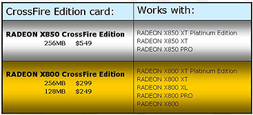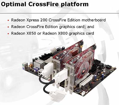 - Технология будет доступна (вначале) только для карт серии X800 и X850. Причем для обычных карт серии X800 необходима X800 карта с технологией CrossFire, а для карты X850 соответствующая CrossFire карта серии X850.