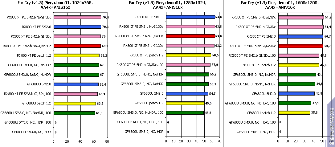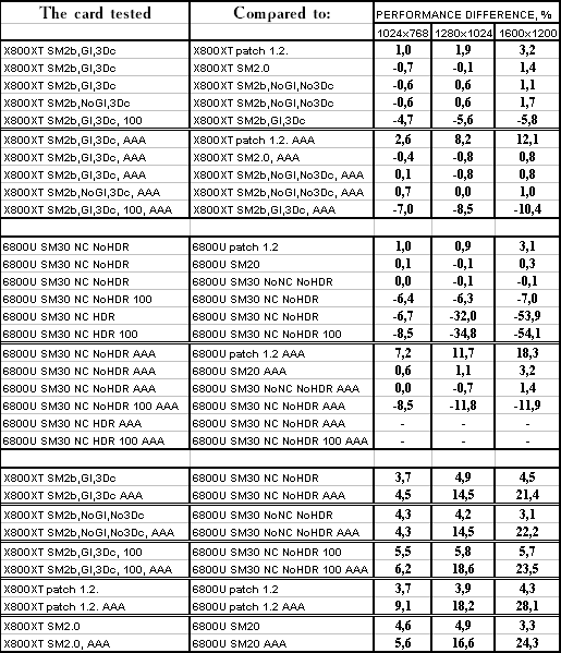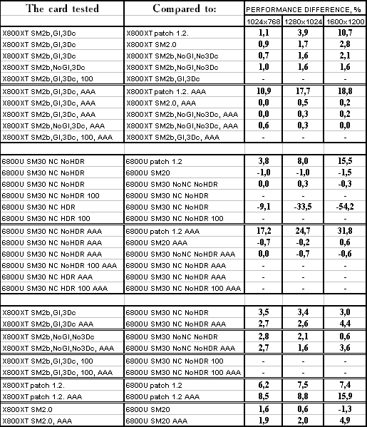 - Использование SM 3.0 против SM 2.0 у GeForce 6800 Ultra аналогично, сложных расчетов освещения (если без HDR) тут нет, поэтому и эффекта нет.