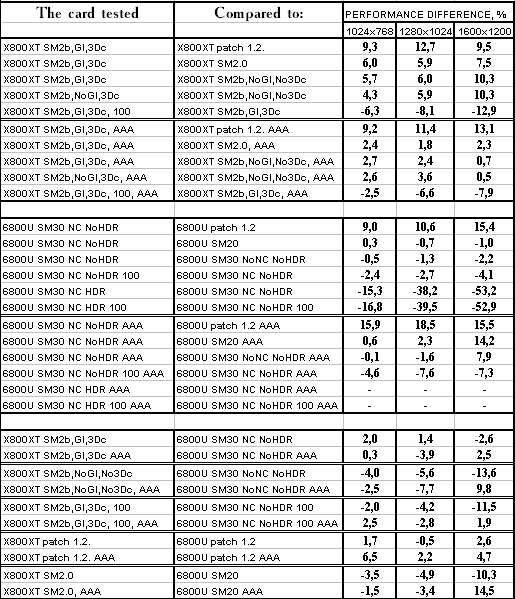 - X800 XT PE против GeForce 6800 Ultra очевидно, что с АА+АФ продукт ATI держит уверенную победу даже если обе ускорителя используют свои возможности максимально (без HDR). А без АА+АФ все во-многом упирается в CPU и потому сравнение может быть некорректным.