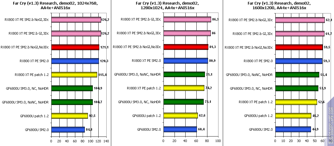 - FarCry 1.2/1.3 (Crytek/UbiSoft), DirectX 9.0c, мультитекстурирование, (запуск игры с опцией -DEVMODE), настройки тестирования все Very High. В числе используемых DEMO имеется от 3DNews.ru