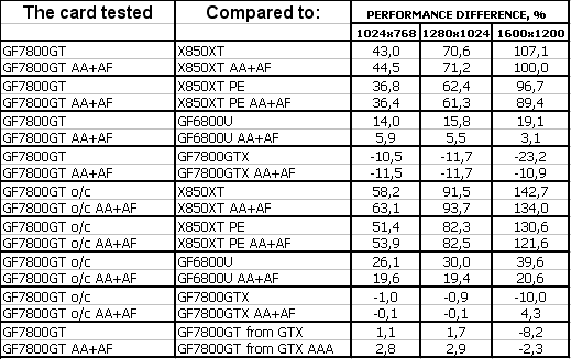 Прежде всего, стоит сказать, что эмуляция 7800GT от натурального продукта практически не отличается по производительности. Что касается соперничества с ATI, то оно очень успешное: победа даже над X850 XT PE. Разумеется, 7800 GT занял промежуточное место между 6800 Ultra и 7800 GTX. Отмечу, как очень важный фактор, что ПСП у 7800 GT меньше чем у 6800 Ultra! Поэтому в приложениях, где производительность сильно зависит от ПСП, может быть даже отставание от NV45 (хотя такие игры уже постепенно уходят в прошлое, на сцену все больше выходит игр, преимущественно нагружающих шейдерные блоки). В данном случае эта игра целиком и полностью зависит от производительности именно таких блоков, и потому мы видим сильное опережение 7800 GT против 6800 U, несмотря на более низкую ПСП.