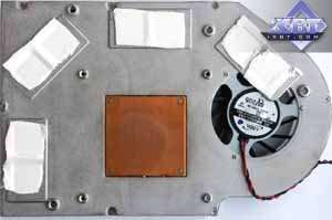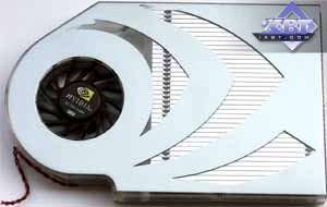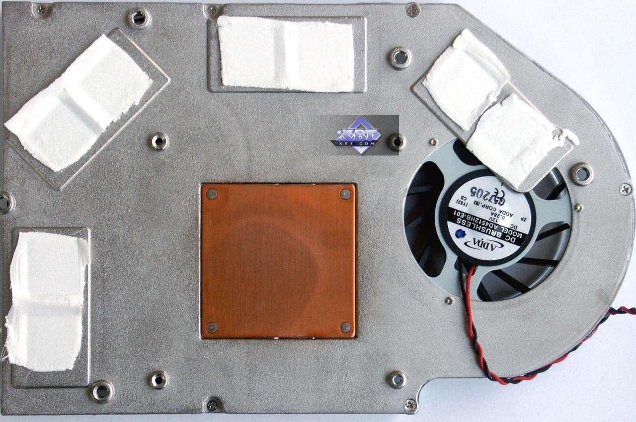 Система охлаждения была тщательно изучена в базовом материале по G70, я лишь напомню, что центральный радиатор с помощью тепловой трубки совмещен с радиатором, охлаждающим память. Далее: устройство в целом очень узкое, однослотовое, что не может не радовать. Кулер в целом очень даже тихий, только на первых секундах после запуска можно слышать небольшой шум от вращающейся на быстрых оборотах турбины. Шум можно оценить на этом ролике (1.5MB, WMV) Относительно кулера от 7800 GTX данная модель отличается уменьшенной длиной радиатора. В месте соприкосновения с кристаллом ядра установлена медная пластина. | ![]() |