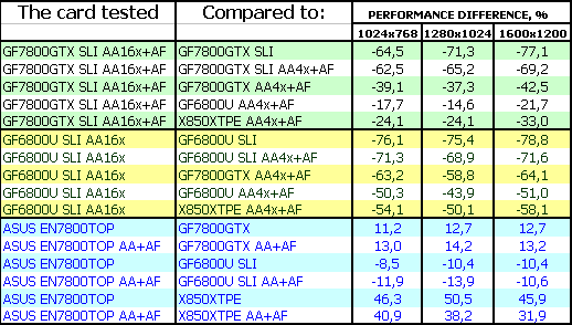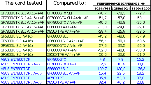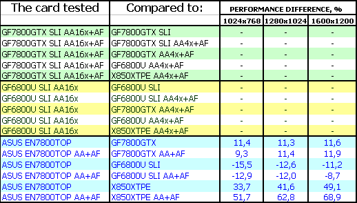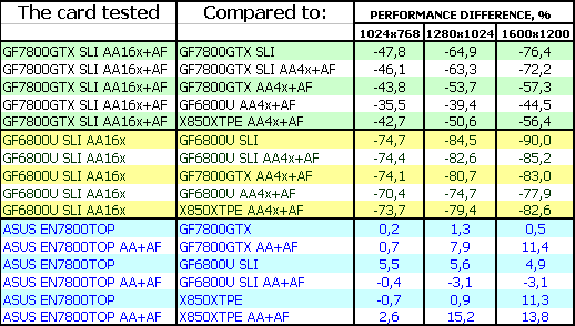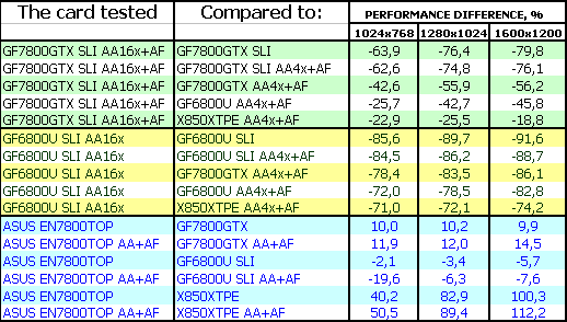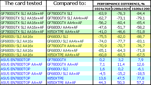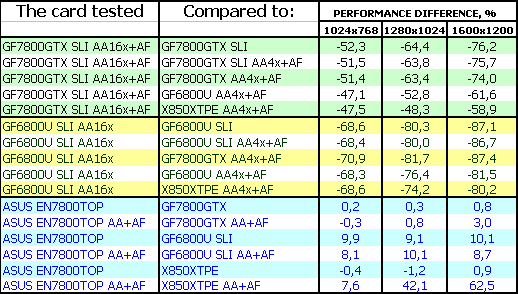 Комментарии будут касаться только ASUS Extreme N7800 GTX TOP 256MB, поскольку скорость обычного 7800 GTX мы уже много раз рассматривали, и повторяться нет смысла. Комментарии к результатам AA 16x с точки зрения производительности также не нужны, и так ясно, что падение капитальное!