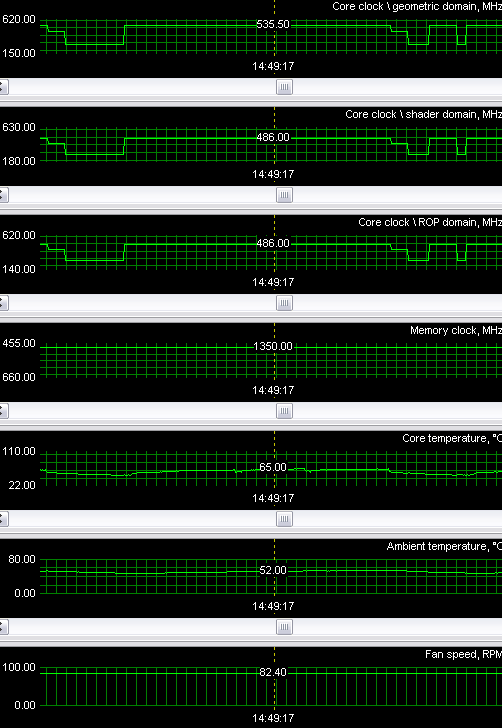 Эта картинка относится к ASUS Extreme N7800 GTX TOP 256MB.   Последняя бета-версия утилиты RivaTuner 15.7 все обрастает и обрастает возможностями перед релизом. Теперь можно мониторить и температуру карты (Ambient) и частоту вращения кулера (если последний reference или имеет такой же четырехштырьковый разъем). Как я выше сказал, кулер у ASUS Extreme N7800 GTX TOP 256MB не имеет такого разъема, и всего два контакта, поэтому на мониторинге выше мы корректных значений частоты вращения и не видим. Теперь о температуре. Несмотря на сильно повышенные частоты работы карты, очевидно, что эффективность кулера очень высока, и температура ядра не превышает 70 градусов даже под самой большой нагрузкой. Единственное, что меня беспокоит — это нагрев радиатора стабилизаторов питания. Ведь при наличии эталонного кулера этот радиатор хоть как-то, но обдувается. Хотя обдув горячим после GPU воздуха трудно назвать хорошим способом охлаждения. Но все же в данном случае этот радиатор вообще под пластиковым кожухом кулера, и доступ воздуха к нему дополнительно ограничился. Будем ждать отзывов, может быть, я перестраховываюсь, а разработчики все проверили и считают, что нагрев элементов блока питания не столь критичен. Разгон. Как известно, блоки ROP/Shader могут работать только на частотах 432,459,486,513 МГц (потенциально и выше, но вряд ли такие чипы найдутся). Только лишь блок геометрии позволяет плавно регулировать его частоту работы. Видеокарта потянула частоту ядра в 513/513/553 МГц, стабильность при разгоне была. По памяти предел — 1400 МГц. Перед тем как провести традиционное тестирование на скорость, давайте посмотрим на практике — а что дает новый режим АА в режиме SLI, ведь обещан супер-режим 16x! Соответственно, качество должно быть просто выше всех похвал! Я не стану утомлять читателей теоретическими выкладками, а сразу приведу таблицу со скриншотами, где будет все видно. Использовались те приложения, которые гарантированно меняют режим работы в зависимости от форсирования АА в драйвере. Кстати, надо отметить, что далеко не все приложения такое позволяют делать, вернее, драйвер не запускает форсированный режим, если того не хочет игра. В частности, 3DMark05 работает только с АА, который можно выбрать в его настройках, форсирование АА в драйверах NVIDIA для этого пакета бесполезно. Вместе с тем, в нем прекрасно работает АА на картах от ATI, если тот выключен в 3Dmark05 и включен только в драйвере.