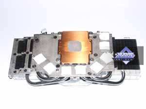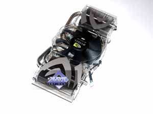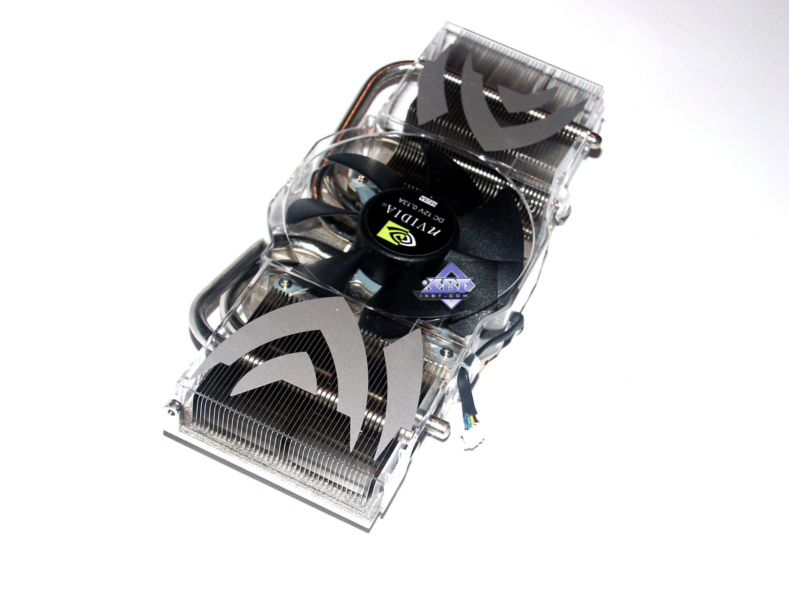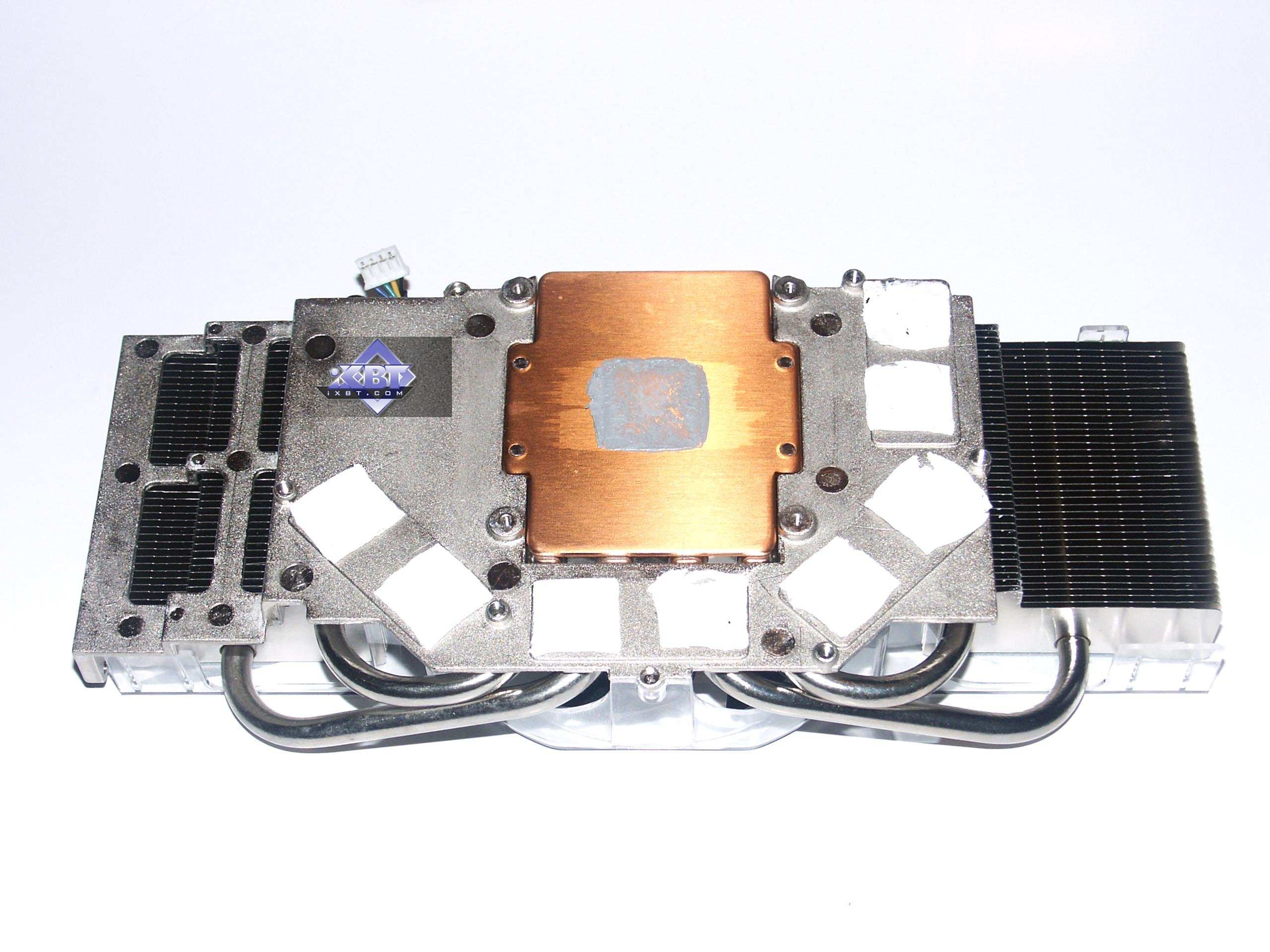 Поскольку используется кулер reference-дизайна, то я приведу описание из базового материала. Система охлаждения уникальна, до сего момента мы подобного не видели. Правда, надо сказать, что такой кулер используется не впервые, все профессиональные продукты из серии Quadro, основанные на аналоге GeForce 7800GTX (G70GL), оснащены таким устройством, поскольку там изначально частоты выше (кстати, я сам не видел этих карт, но могу предположить, что именно на Quadro ставят 512 мегабайт 1.6ns GDDR3 и используют ту же самую PCB от 7800 GTX 256MB, но уже полноценно комплектуя ее всеми микросхемами памяти). Несмотря на свои размеры и кажущуюся сложность конструкции, кулер работает просто: большой вентилятор прогоняет воздух через левый и правый радиаторы, к которым подведены тепловые трубки, несущие тепло от платформы, прижимающейся к ядру и микросхемам памяти. Прижим к последним производится через текстильные термоэлементы, пропитанные специальной пастой. Для соприкосновения с GPU имеется медная площадка с хорошо отполированной поверхностью. Не надо стараться мысленно затыкать уши, предвкушая шум такого кулера! Вентилятор вращается на частоте всего 1000 оборотов в минуту! И потому шума просто нет! Да, при старте компьютера, кулер раскручивается примерно на 4000-5000 оборотов и создает шум, но это всего на 5-6 секунд. Да и рева, как, например, у кулера от RADEON X850, нет. Система охлаждения имеет большие размеры и занимает ближайший к видеокарте слот, но, думаю, что на сегодня это уже не злободневная проблема. | ![]() |