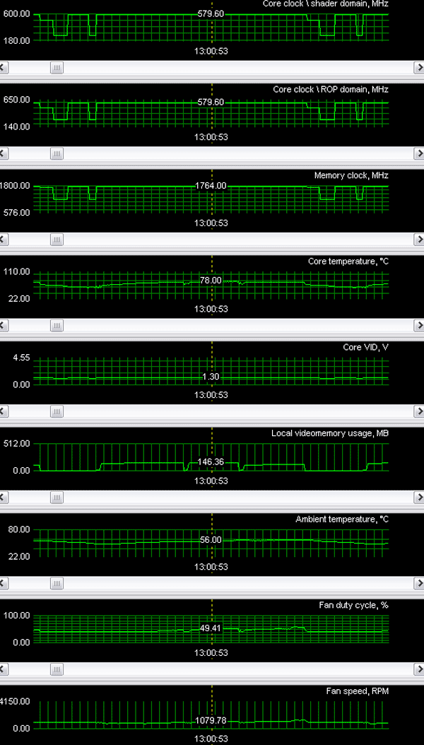 Я уже ранее отмечал, что система охлаждения у GTX 512Mb работает очень эффективно, и потому при самой большой нагрузке на штатных частотах нагрев ядра не достиг и 80 градусов (замечу, что штатные частоты для GS выше, чем у референс). Пиковая частота вращения - 100% - это 2000 оборотов. И все равно шума нет.