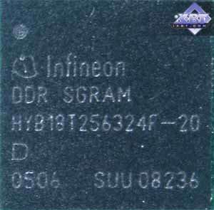 | Карта имеет 256 МБ памяти GDDR3 SDRAM, размещенной в 8-ми микросхемах на лицевой стороне PCB. Микросхемы памяти Infineon. Время выборки у микросхем памяти 2.0ns, что соответствует частоте работы 500 (1000) МГц. | ![]() |
