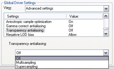 В драйверах можно выбрать один из двух режимов работы transparent antialiasing: мультисэмплинг и суперсэмплинг. Либо выключить новые режимы вообще (это значение по умолчанию), тогда мы получим антиалиасинг, аналогичный реализованному в чипах NV40-NV45.