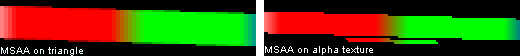 Как известно основная проблема MSAA (мультисэмплинг) состоит в том, что он сглаживает только края полигонов. Если полигон прозрачный или полупрозрачный (например, стекло, или решетка проволочного забора в игре сделанная из текстуры, в которой прозрачные пиксели чередуются с непрозрачными), то сглаживания границ с тем, что проступает через этот полигон не происходит, и мы видим четкие ступеньки. Зато нам не приходится рассчитывать значения цвета для каждого отсчета (сэмпла), и мы обходимся только раздельными значениями глубины, а цвет один общий на все сэмплы. Основную проблему - ступеньки на краях полигонов такой метод устраняет эффективно. Но с прозрачными полигонами он не справляется. Второй метод - SSAA (суперсэмплинг) честно рассчитывает все значения цвета для всех отсчетов, и мы получаем правильную картину даже через полупрозрачные полигоны с четкими границами прозрачных и непрозрачных областей. Однако, тогда мы заметно проигрываем в скорости - нам надо выполнить пиксельные шейдеры в несколько раз больше - столько сколько у нас отсчетов, 2 или 4 раза.