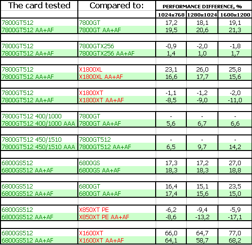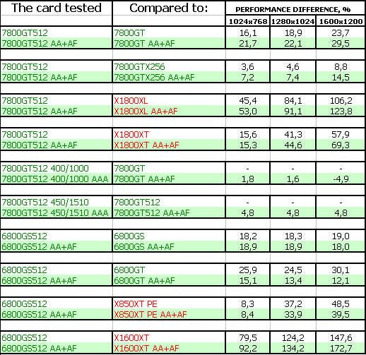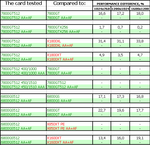 Кстати, в нашем исследовании ниже я провел тесты 7800 GT еще и на номинальных частотах 400/1000 для сравнения с 256-мегабайтным аналогом, и при разгоне по памяти до 1510 МГц для изучения влияния ПСП на такие платы.