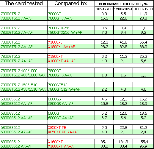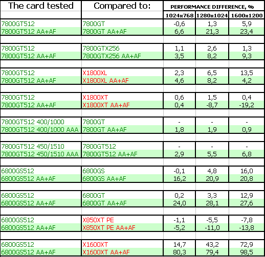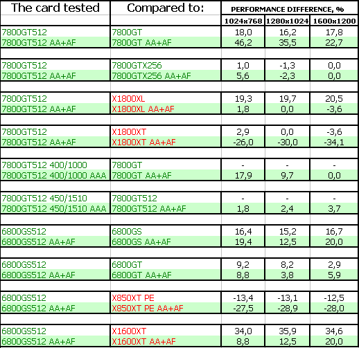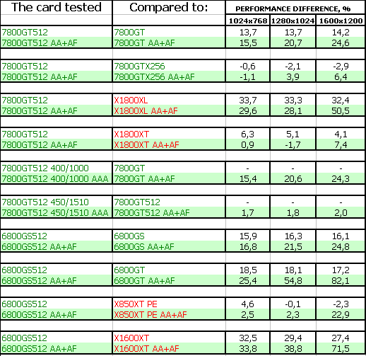 Ситуация у 7800 GT очень хороша, он вышел победителем. Правда, то, что HDR+AA не работают — ложка меда в бочке меда. Хотя именно карта не виновата, тут вина NVIDIA.