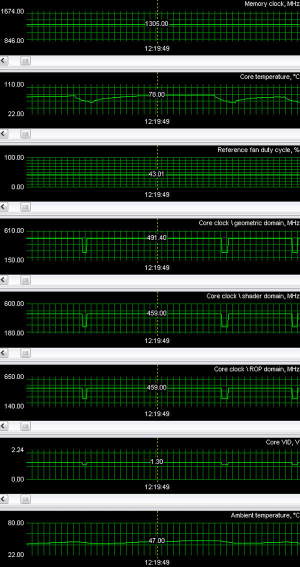 Мониторинг, проведенный с помощью программы RivaTuner (автор А.Николайчук), показал, что в условиях работы в закрытом корпусе при наличии штатной продувки (от Chieftech) температура ядра у 7800 GT под нагрузкой поднималась почти до 80 градусов. Это нормально, и даже весьма хорошо, что при таком повышении частот температура GPU все равно находилась в пределах допустимого. Поэтому, несмотря на то, что система охлаждения не выносит сама горячий воздух за пределы системника, температурный режим оптимален.