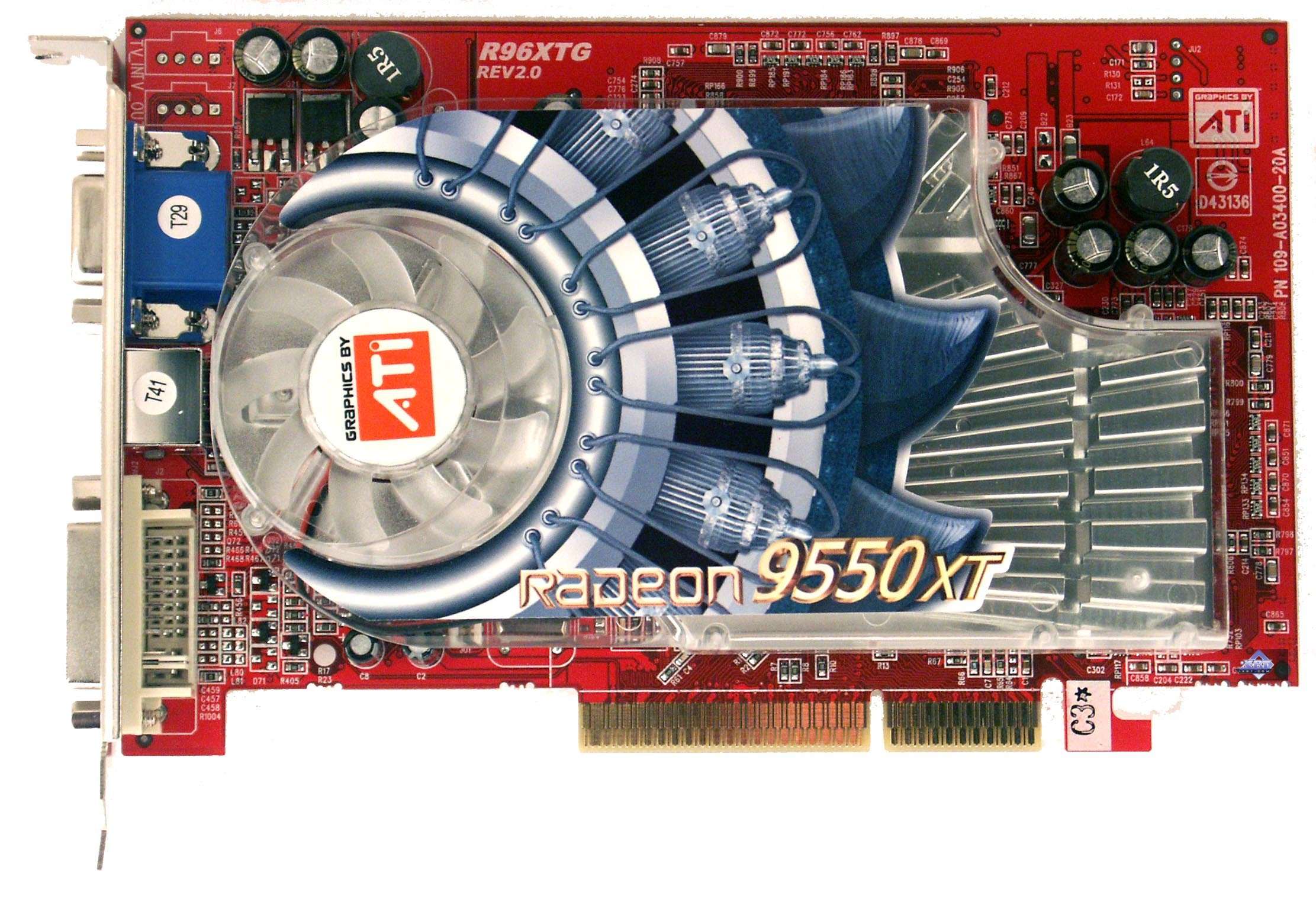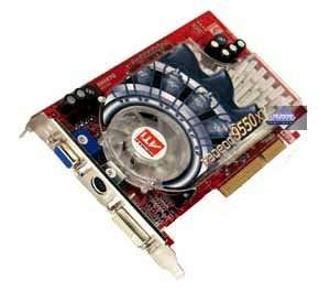 | Карта имеет интерфейс AGP x8/x4, 128 МБ памяти DDR SDRAM, размещенной в 8-ми микросхемах на лицевой и оборотной сторонах PCB. Микросхемы памяти EtronTech (BGA). Время выборки у микросхем памяти 3.3ns, что соответствует частоте работы 300 (600) МГц, память же работает на частоте 250 (500) МГц. Частота работы GPU  400 MHz. Шина обмена с памятью — 128 bit. Обратите внимание на повышенные частоты относительно обычного RADEON 9550 (250/200 (400) MHz). |  |