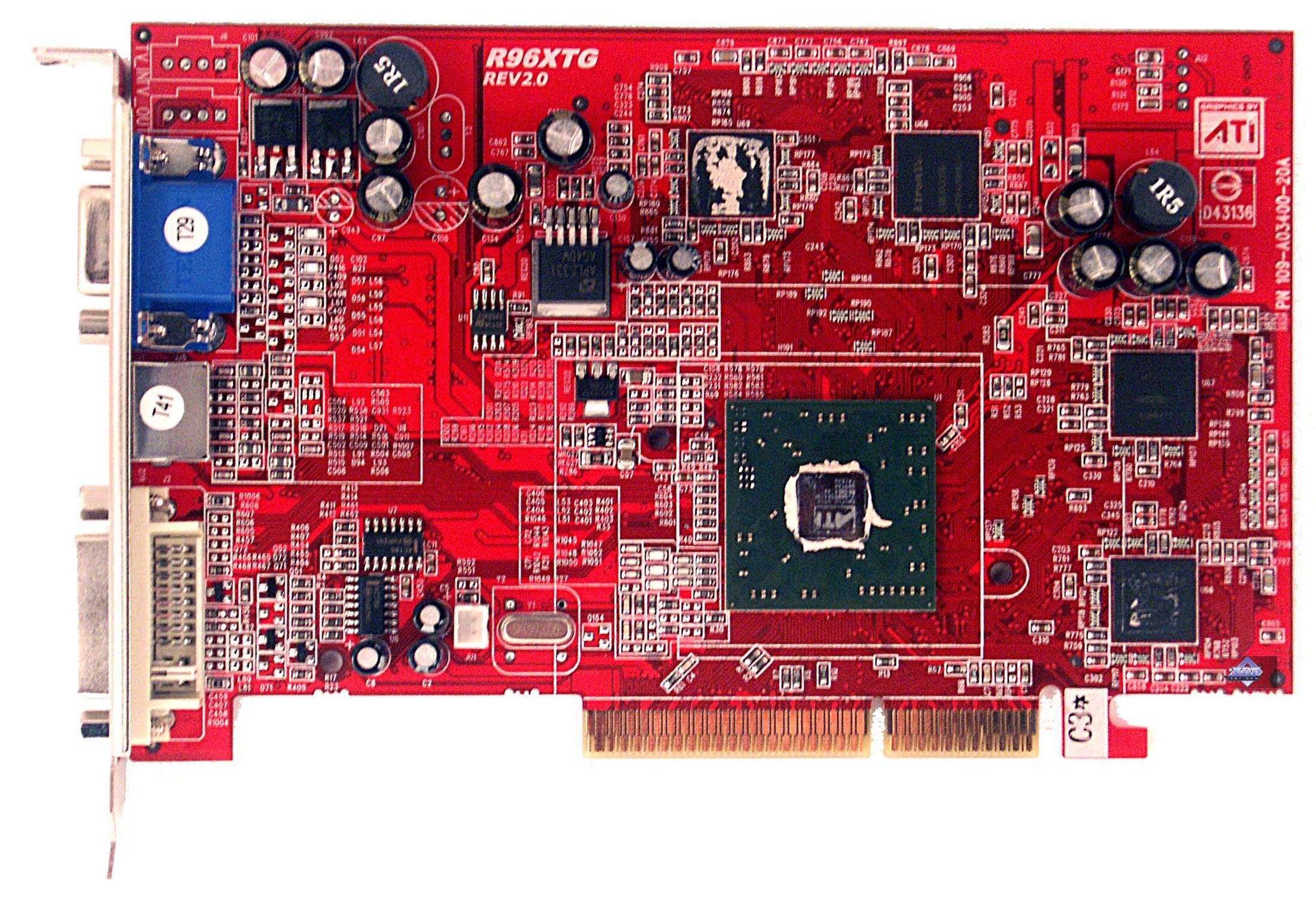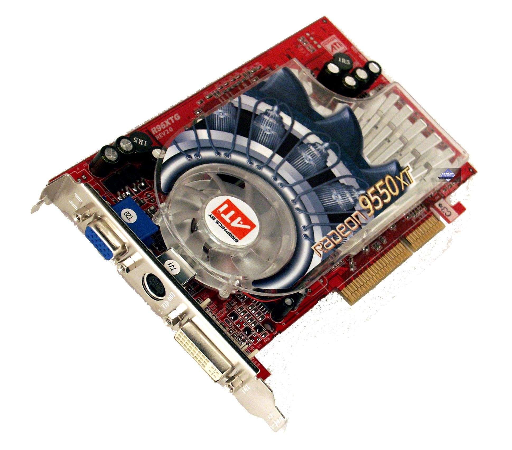 А вот GeCube RADEON 9550 XT Extreme очень интересна. Как мы видим, у карты дизайн хоть и схож с RADEON 9600 XT (не случайно сравнение было именно с ним, ведь на PCB карты есть условное обозначение RG96XT, что явно говорит о том, что PCB принадлежит к 9600 XT), но имеет свои отличия, связанные, прежде всего, с тем, что на плате есть разводка под RAGE Theater (VIVO), хотя сам кодек не установлен.