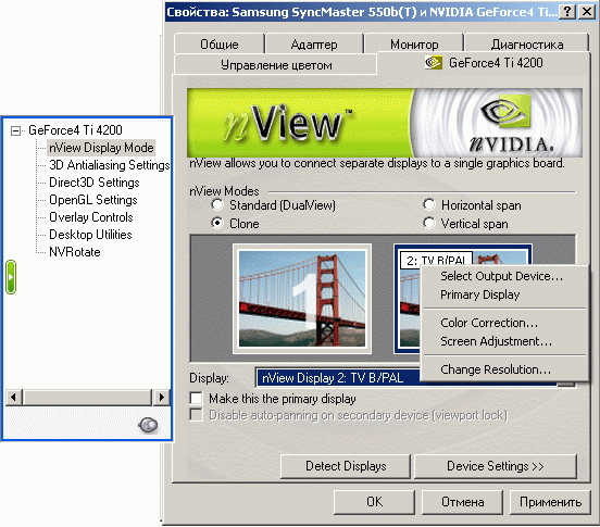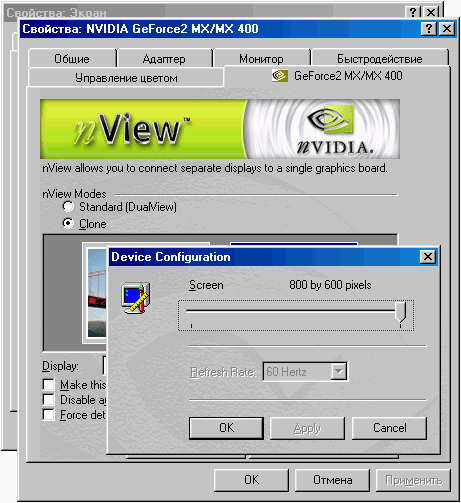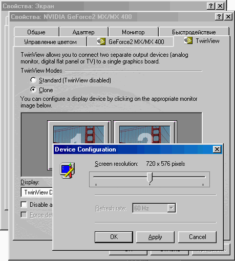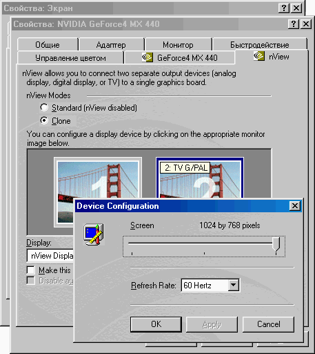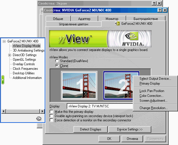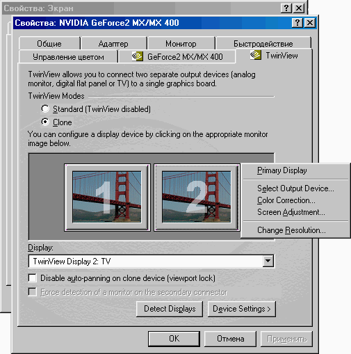 Для просмотра разных изображений на мониторе и телевизоре благодаря технологии TwinView (nView) у видеокарт GeForce2MX/4MX/4ti можно с успехом использовать режим Clone, главное при этом правильно настроить драйвер.