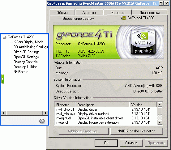 Закладка nView видеокарты GeForce4ti, Detonator 40.41, WindowsXP.