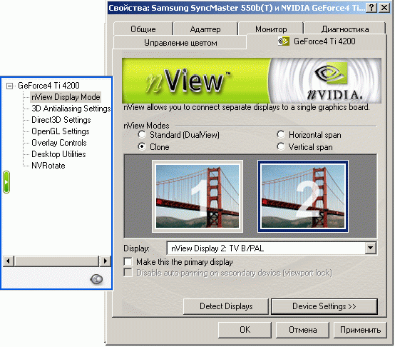 - Clone, собственно TwinView (nView): изображение на телевизоре копирует (с некоторыми оговорками) изображение на мониторе.