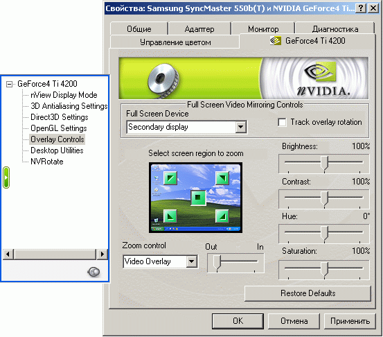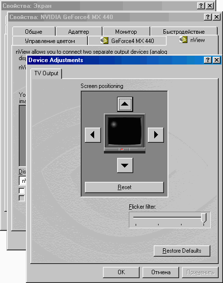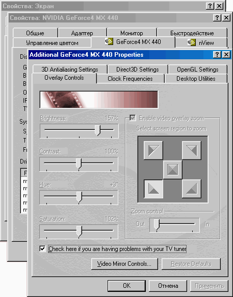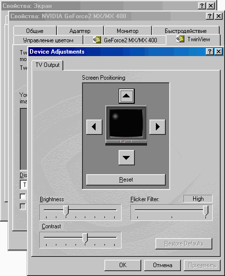 Следующий раздел называется "Настройка экрана". Отсюда можно откорректировать положение изображения на экране телевизора, основную яркость и контрастность, а также задействовать "Фильтр мерцания". Действие "фильтра мерцания" различно для разных видеокарт (а, возможно, и их VideoBIOS) и версий драйвера Detonator. В ряде случаев лучший результат получается в положении "Высокий", в других "Низкий" или "Выключено". Что лучше конкретно для Вашей видеокарты можно легко проверить, к счастью, это сделать несложно. По-видимому, чтобы не вносить путаницы, в ряде новых Detonator NVIDIA отказалась от наименования значений "Фильтра мерцания", оставив лишь безымянную линейку. Легко заметить, что в зависимости от модели видеокарты (ее VideoBIOS) и версии Detonator иногда исчезает доступ к настройке "Яркость" и "Контрастность". А ведь это единственная такая настройка, которая распространяется на режим Overlay (см.ниже).