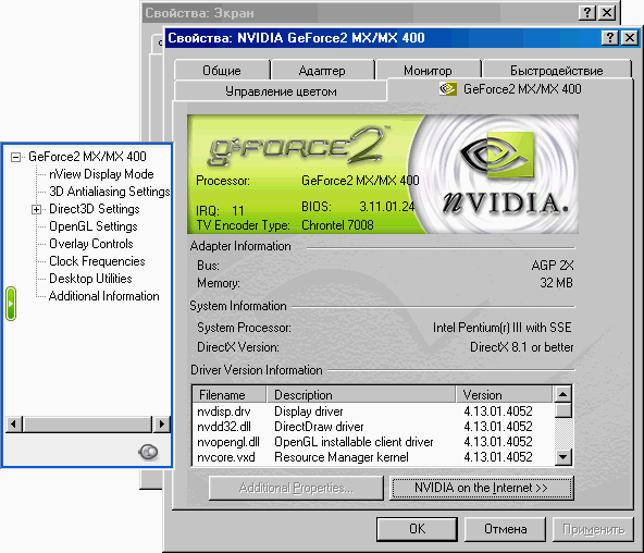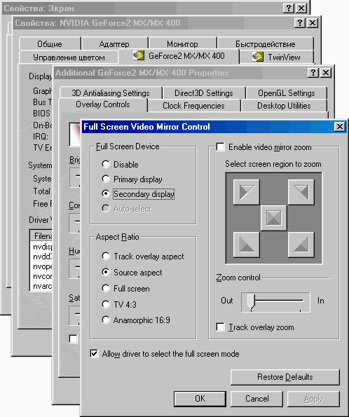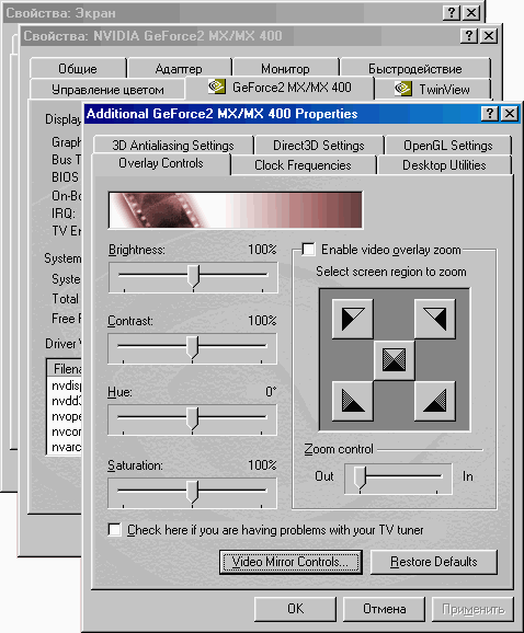 Дальнейшее рассмотрение производится на примерах более старых Detonator 21.85 с видеокартой GeForce2MX с TV-Out ChronTel7008, Detonator 28.32 с видеокартой GeForce4MX с внутренним TV-Out и новых Detonator 40.52 с видеокартой GeForce2MX с TV-Out ChronTel7008 под Windows98SE, а также Detonator 40.41 с видеокартой GeForce4ti4200 с ViVo Philips7108 под WindowsXP.