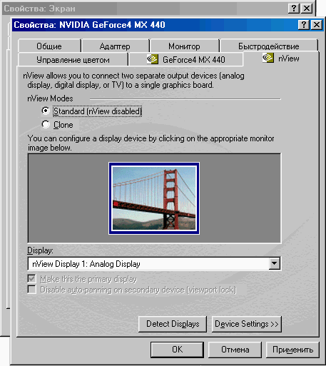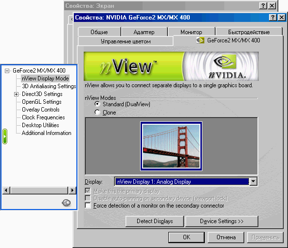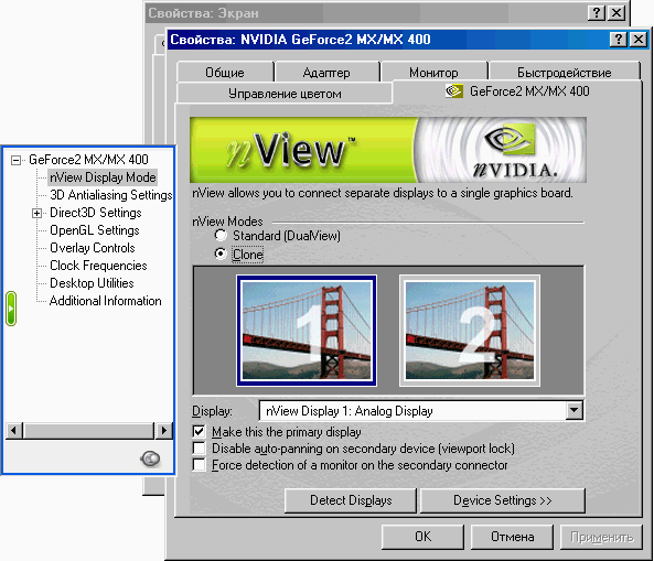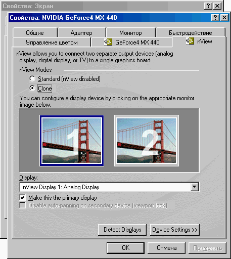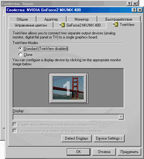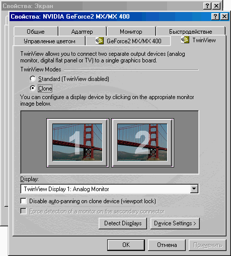 Перейдем к разделу настроек драйвера видеокарты, скрывающемуся за кнопкой "Дополнительно" "Свойства: NVIDIA GeForce2MX/MX400" (на видеокартах GeForce4(4MX) соответственно "Свойства: NVIDIA GeForce4ti/GeForce4MX)" На закладке "TwinView" этого раздела имеется возможность активизировать режим "Клон" ("Clone")