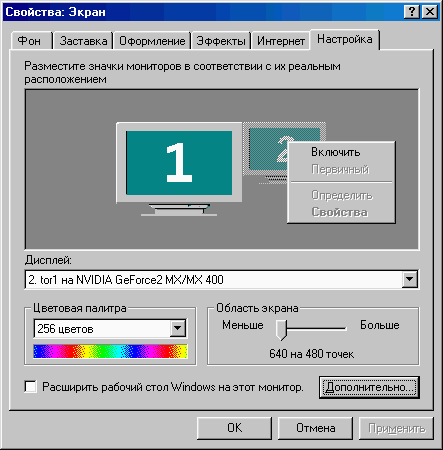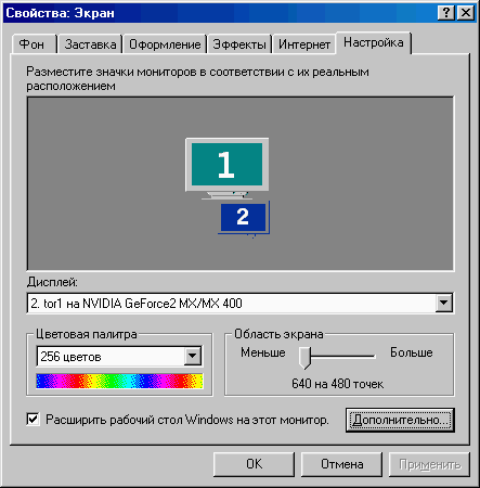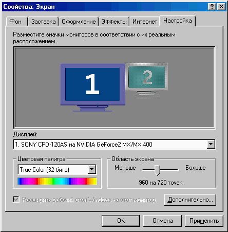 Режим "Extend" включается прямо на первой закладке "Свойства: Экран"