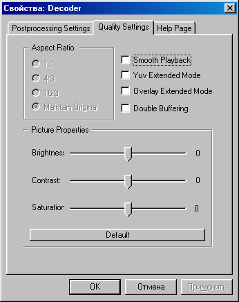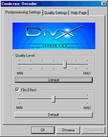 Страница настройки "Postprocessing Setting" видеофильтра DivX™Video 5.0.2