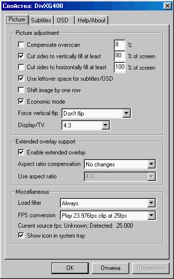 Дополнительный видеофильтр DivXG400 первоначально был задуман для однозначного включения режима Overlay на видеокарте Matrox G400 (что видно и из названия видеофильтра) при воспроизведении фильмов, размер которых по горизонтали не кратен 32. Однако выяснилось, что DivXG400 прекрасно работает и с видеокартами NVIDIA (хотели, как лучше, а получилось еще лучше :-) ). Постепенно видеофильтр приобретал новые функции появилась компенсация Overscan, функция обрезания боковых сторон фильма для увеличения "полезной площади" экрана, включения Extended Overlay для возможности воспроизведения видео на телевизоре при свернутом окне видео на мониторе, показ субтитров и времени (текущего и с начала воспроизведения), FPS compensation (позволяющая за счет небольшого ускорения воспроизведения смотреть фильмы с числом кадров, отличном от 25 кадров в секунду без периодических подтормаживаний), Flip (переворачивание картинки) и множество других весьма полезных функций.