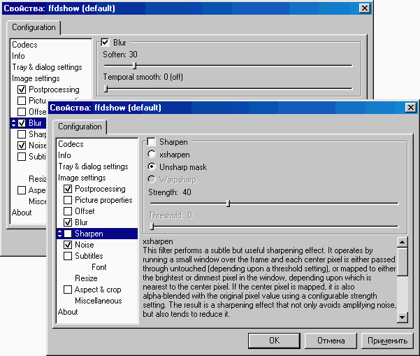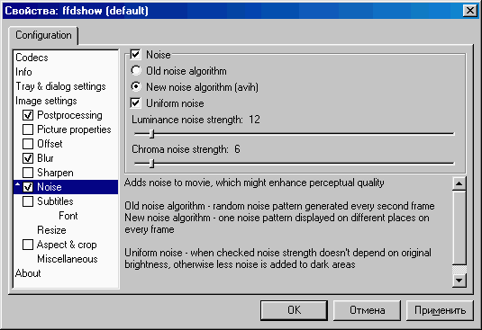 в частности, регулировка четкости и смягчения картинки.Настройка FFDShow на добавление к сигналу шума, маскирующего артефакты.