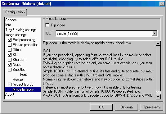 Функция переворачивания картинки "Flip video", аналогичная по действию такой же функции в DivXG400. Меняя IDCT, можно попытаться улучшить качество или уменьшить нагрузку на процессор за счет разных способов декодирования.