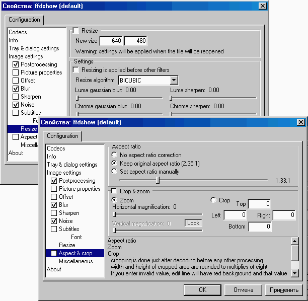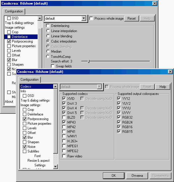FFDShow быстро прогрессирующий декодер. От версии к версии появляются все новые возможности по обработке изображения, поддержка новых стандартов. Помимо поддержки DivX (Mpeg-4) всех видов появилась (пока, правда, еще слабая, но "лиха беда-начало") поддержка VideoCD (Mpeg-1) и даже DVD (Mpeg-2). Растет и число дополнительных способов обработки изображения для повышения качества и удобства. Помимо традиционных видов постпроцессорной обработки, регулировки яркости, контрастности и гамма-коррекции, добавления белого шума для маскирования артефактов. появились широкие возможности по обрезанию, масштабированию и сжатию изображения, множество других полезных настроек.