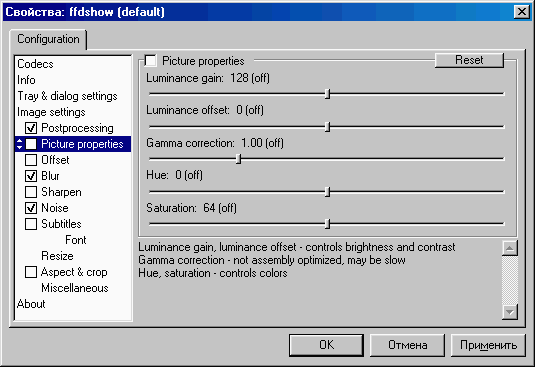 при слишком большой нагрузке процессора.Настройка яркости, контрастности и гаммакоррекция в FFDShow выведена в отдельную закладку.