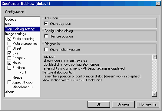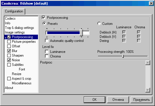 Очень удобно для оперативного доступа к настройкам.Настройка уровня Postprocessing видеофильтра FFDShow.