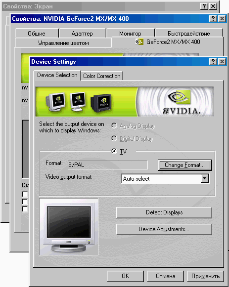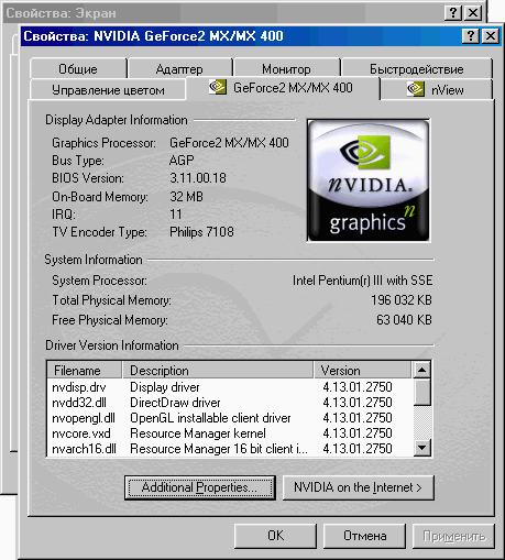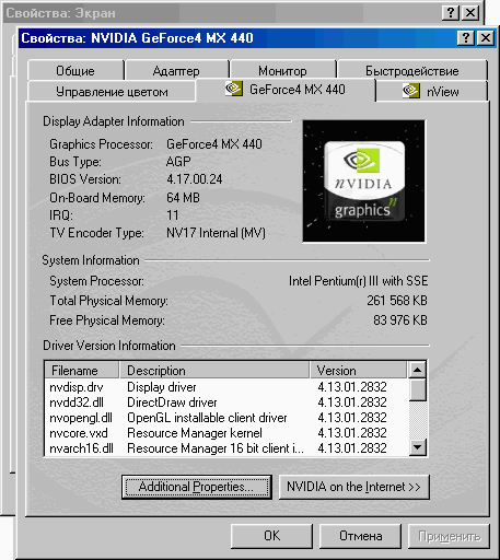 Совершенно очевидно, что для видеокарт GeForce4MX и GeForce4ti использовать драйвера Detonator более старых серий, чем 27.хх, нельзя они просто еще "не знают" о существовании таких видеокарт. Но и здесь принцип "чем новее тем лучше" не срабатывает: видеокарты GeForce4MX с некоторыми версиями VideoBIOS в сочетании с рядом драйверов Detonator из серий 28.хх и 29.хх "не видят" наличия TV-Out и, соответственно, не могут вывести изображение на телевизор. Причем с другой версией VideoBIOS проблем может и не быть, и TV-Out будет нормально функционировать. Исправленный BIOS для МХ440 с внутренним TV-encoder можно взять здесь. У авторов также имеются сведения, что такая проблема может возникать с рядом Detonator серий 28.хх и 29.хх не только у GeForce4MX, но и у GeForce2MX и GeForce4ti с определенными VideoBIOS. Так что если у Вашей видеокарты после установки очередного драйвера Detonator (с которым на соседском компьютере телевизор прекрасно работает) вдруг перестал определяться TV-Out, не спешите бежать в гарантийный отдел фирмы-продавца, а попробуйте для начала установить другой Detonator. Для контроля можно попробовать вернуть тот, что работал до неудачной перестановки драйвера, и в случае успеха или искать новый Detonator с работающим TV-Out или прошивать другой VideoBIOS (более новый или более старый). То же самое можно порекомендовать, если видеокарта Вашего компьютера "видит" TV-Out, но доступны не все настройки TwinView (nView). Авторы, к сожалению, не располагают полной базой "совместимых" версий VideoBIOS и драйверов Detonator, так что здесь Вам, уважаемые читатели, придется вести самостоятельные исследования.