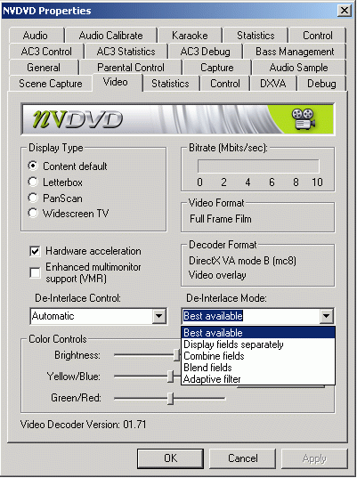 Во-первых, NVDVD, доросший к настоящему моменту уже до версии 1.71 :-), предоставляет выбор из большого количества режимов деинтерлейсинга извечной проблемы NVIDIA.