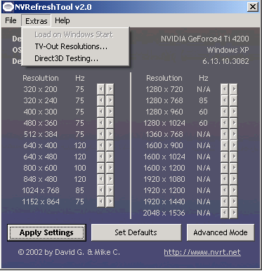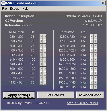 Все программы, попадавшиеся авторам (PowerStrip, Reforce, RefreshLock, RivaTuner :-) ), с этой задачей справлялись, но наиболее симпатична автору все же NVRefreshTool, имеющая, пожалуй, самый простой и понятный интерфейс (вся настройка сводится к нажатию кнопки Apply Settings и последующей перезагрузке :-)).