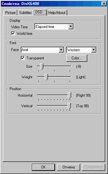 - "Force vertical flip" возможно перевернуть картинку, если она идет вверх ногами.В видеофильтре DivXG400 активизирована индикация времени, прошедшего с начала фильма, и текущего времени в правом верхнем углу экрана видео.