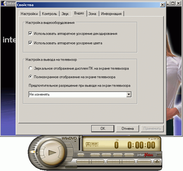 Надо отметить, что разработчики программ вывода изображения стараются поддерживать новые возможности железа, так, например, WinDVD4 умеет работать с телевизором своими средствами, избавляя от необходимости вникать в настройки драйвера :-)