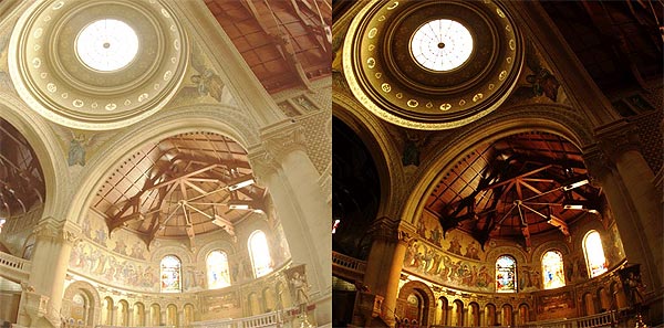 На всякий случай поясню на картинке справа изображено то, что более точно соответствует типичному освещению в соборе. Как раз эта картинка и рассчитывалась с использование гамма коррекции.