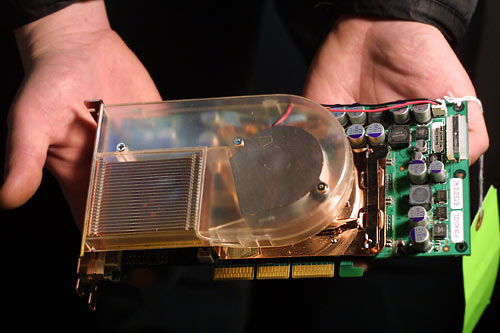 В наличии разъем для внешнего дополнительного питания, один DVI, один TV-Out и один VGA разъем. Два чипа Silicon Image отвечают за двуканальный (до 2048х1536) DVI интерфейс, чип Phillips за TV-Out. В GeForce FX и на этой карте использованы уже опробованое решение на базе внешних интерфейсных чипов это характерно для топовых продуктов NVIDIA. В последующих продуктах для ниши Mainstream TV-Out и DVI интерфейсы скорее всего будут интегрированны в чип. В наличии 8 микросхем DDR2 памяти SAMSUNG 128 Мбайт 128 бит, 1 ГГц эффективной частоты передачи данных. Интересно что микросхемы памяти расположены достаточно далеко от чипа видимо 128 бит шина и улучшенные интерфейсные характеристики DDR2 позволили сделать разводку более простой. Официальная тактовая частота чипа 500 МГц, в будущем вероятно появление разных (возможно и более быстрых) вариантов карт на основе GeForce FX. Как вариант может быть использовано решение с наружным забором или отводом воздуха, наподобие разработанной компанией Abit технологии: