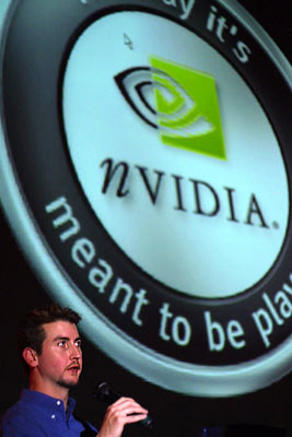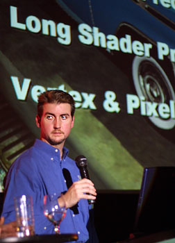 Его презентация посвящена непосредственно GeForce FX. Он не только рассказывает о характеристиках нового GPU но и демонстрирует карту на его основе, а также ее работу в составе демонстрационной системы. Все присутствующие с удовольствием наслаждаются демонстрационными программами NVIDIA и технологическими демками будущих игр. STALKER погружает зал в тишину зрители неотрывно смотрят на экран, с удивлением узнавая привычные элементы. Поверьте, на большом киноэкране игра с таким уровнем детализации выглядит ничуть не менее "кинематографично", чем Final Fantasy! Все затаив дыхание наблюдают за фантастически реальным (если так можно выразится) пейзажем заброшенного советского завода (или НИИ) из демонстрационного пролета в тестовой версии движка STALKER. Заметно, что обилие геометрии заставляет порой притормаживать даже GeForce FX. По субъективным ощущениям средняя скорость 15…30 кадров в секунду. Отметим что на GeForce4 MX440 эта игра идет со скоростью около одного или двух кадров, причем с артефактами. На GeForce4 Ti 4600 около 8..12 кадров. Что ж, эта игра будет серьезным аргументом за покупку нового ускорителя.