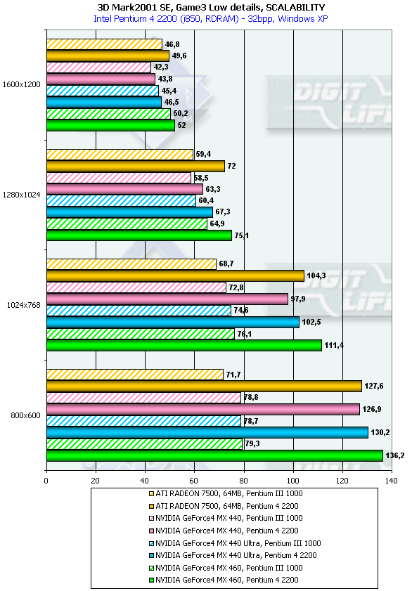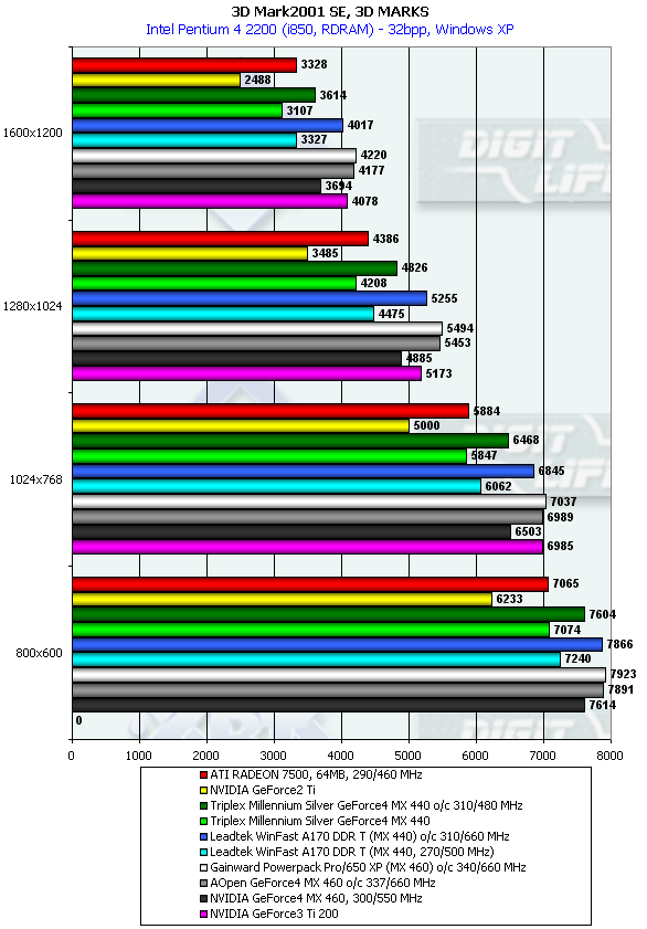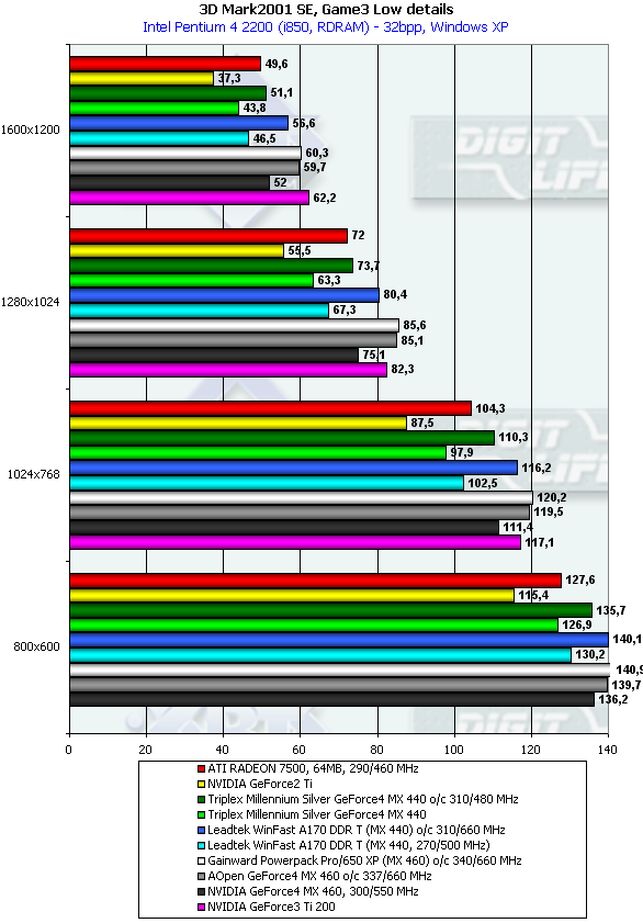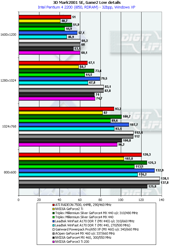 В целом картина вырисовывается такая: карты на базе MX 440 идут вровень с RADEON 7500 и значительно быстрее, чем GeForce2 Ti (плата от Leadtek с увеличенной частотой работы памяти немного опережает карту от ATI на низких разрешениях, а карта от Triplex чуток отстает). MX 460 немного отстает от GeForce3 Ti 200, но разгон делает их более быстрыми, и подчас Ti 200 уже не является лидером.