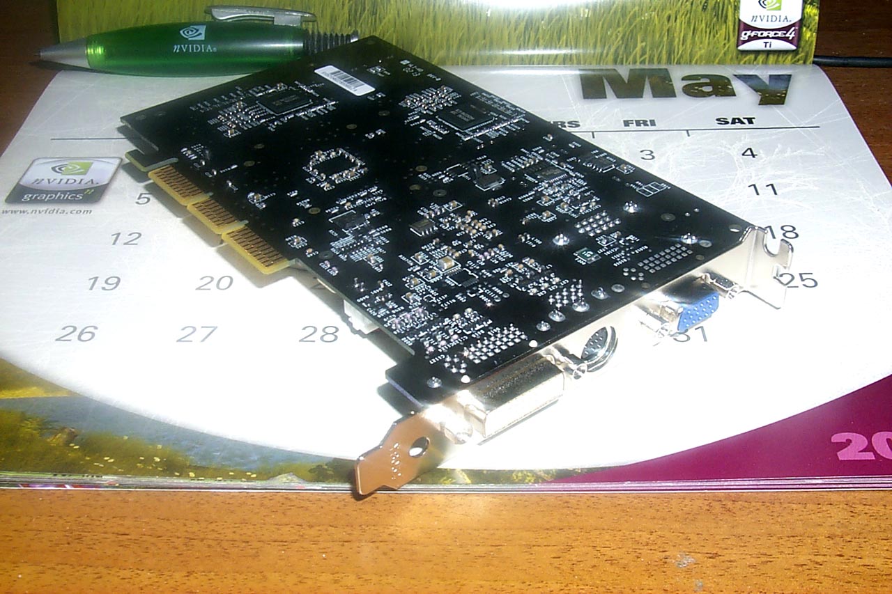 Третья карта (от Leadtek), несмотря на то, что это GeForce4 MX 440, выполнена на PCB от MX 460 и комплектуется такой же памятью в новой упаковке BGA со временем доступа 3.6ns. Как мы видим, чтобы не создавать конкуренцию "двуголовой" карте на MX 460, на этой плате нет разъема DVI.